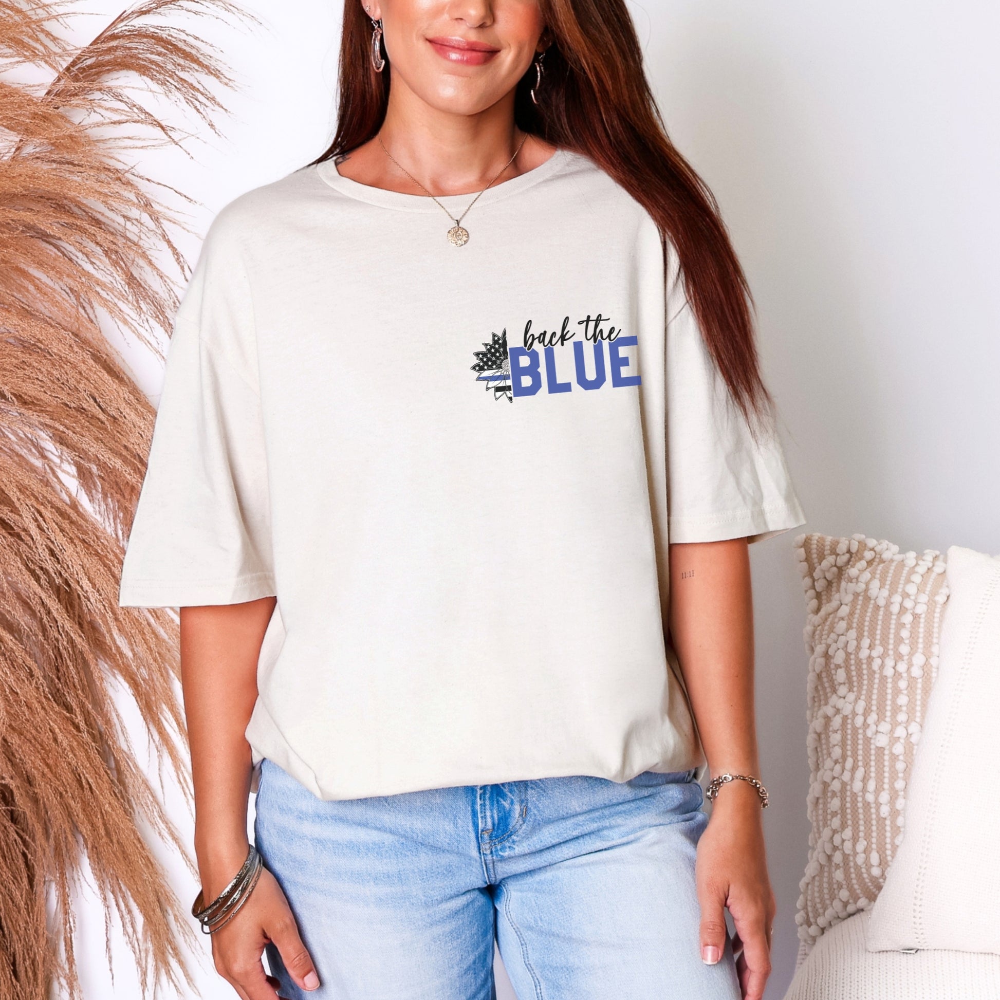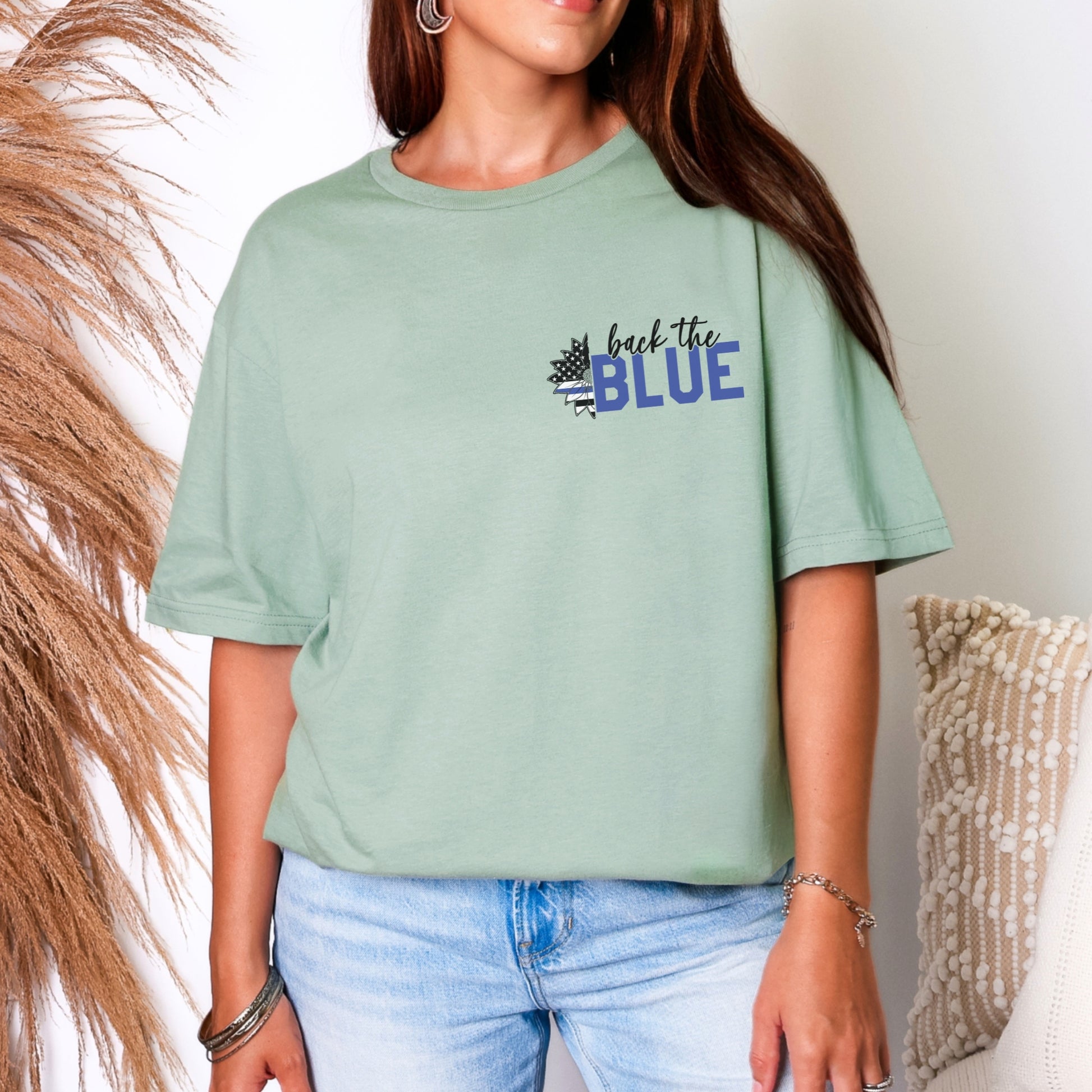 The front features a small “Back the Blue” design over the left chest — clean and confident — while the full back design showcases the striking sunflower with a patriotic flair. Together, they create a look that’s equal parts supportive statement and timeless everyday wear.
