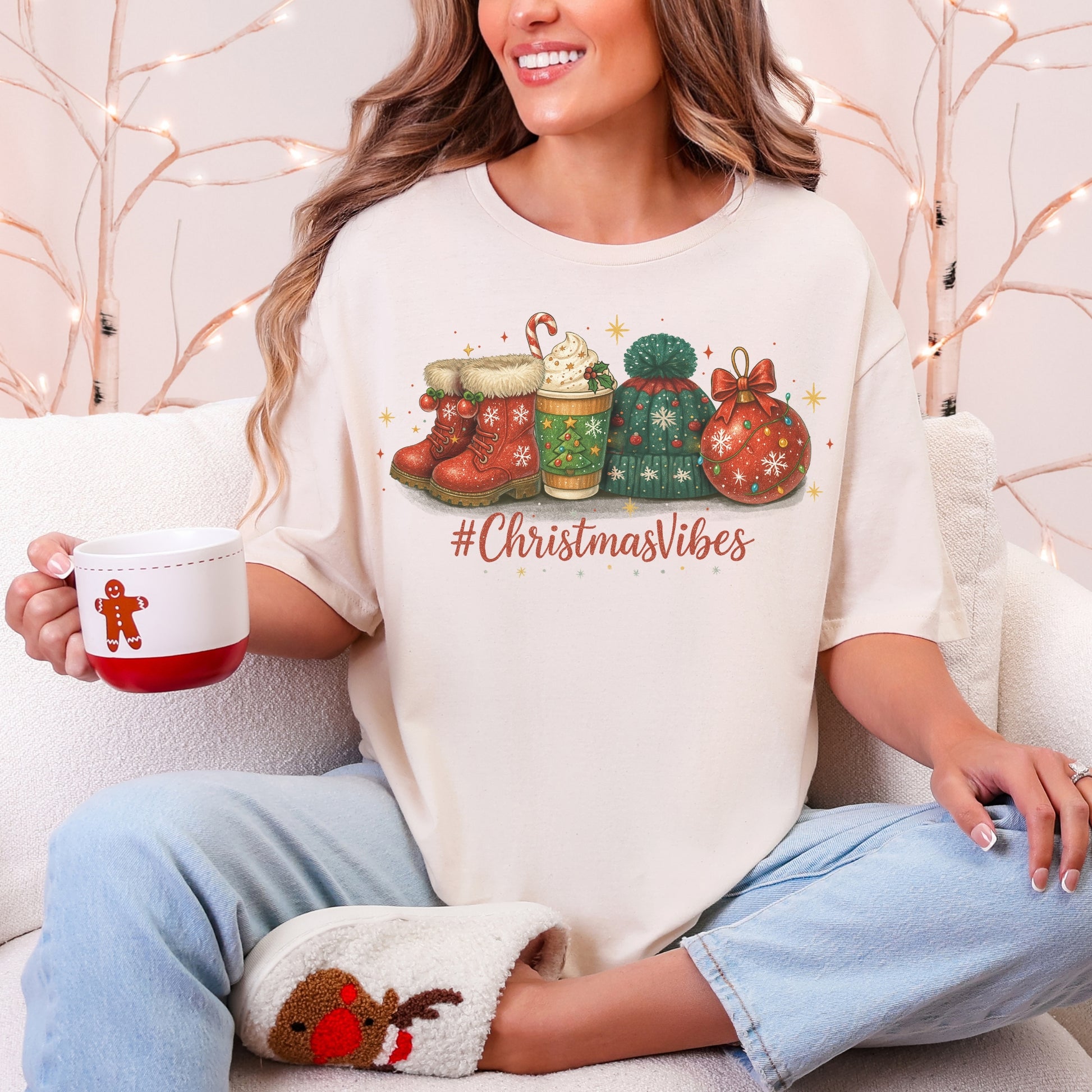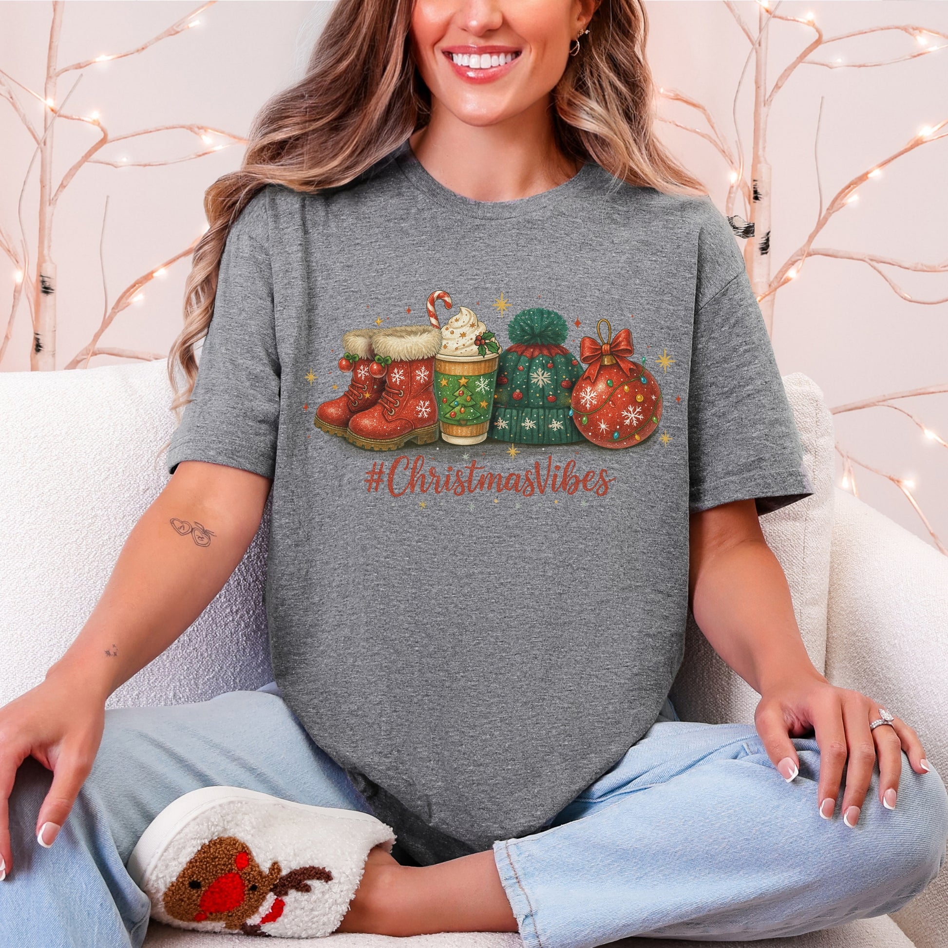 The holidays aren’t just a season—they’re a whole vibe. This tee captures that feeling we all wait for all year long: warm drinks in hand, lights twinkling, gifts wrapped, and Christmas music humming in the background. With a festive lineup of boots, cocoa, and gifts under the hashtag that says it all—#ChristmasVibes—this design is cheerful, cozy, and just the right amount of playful.