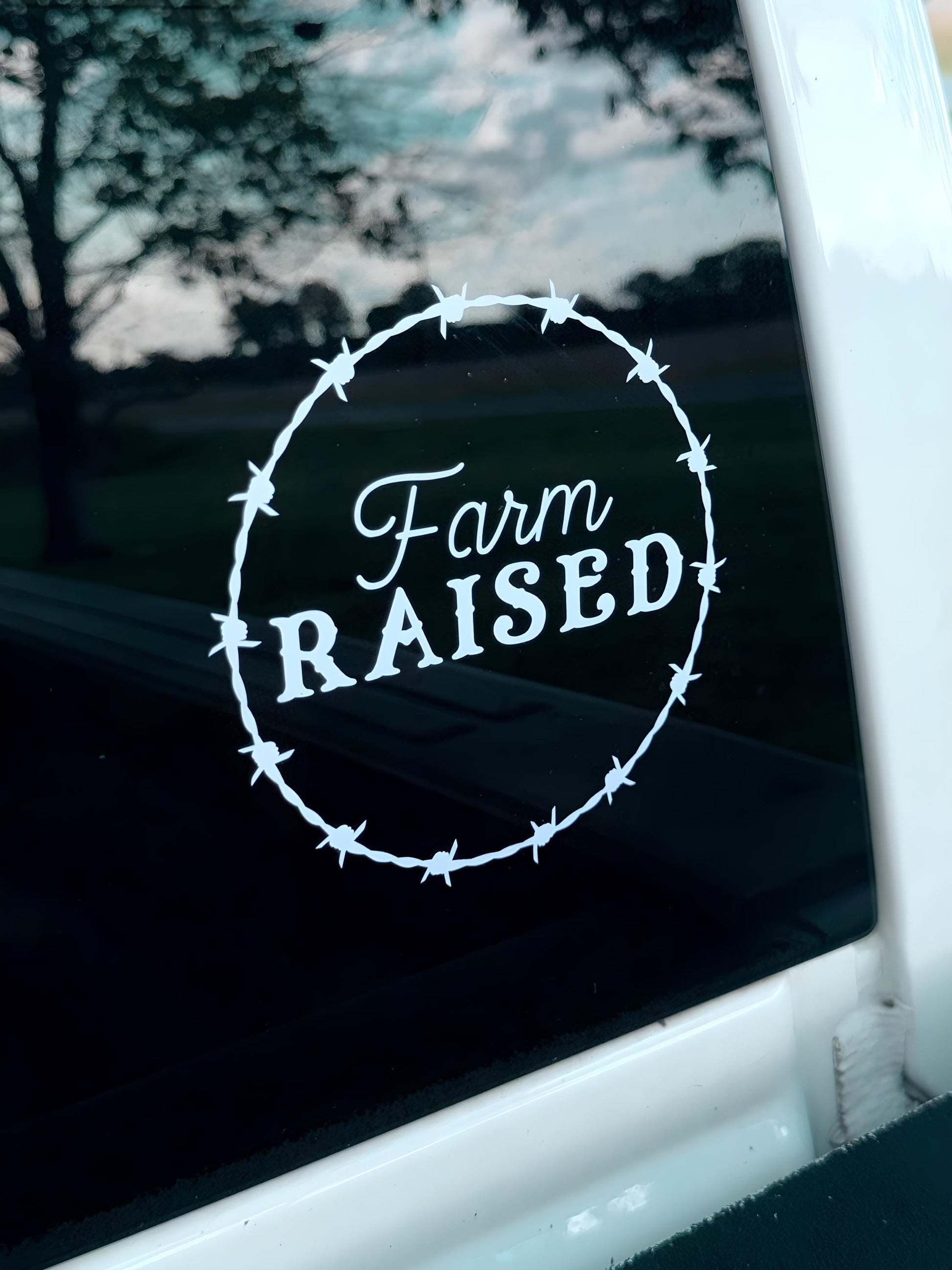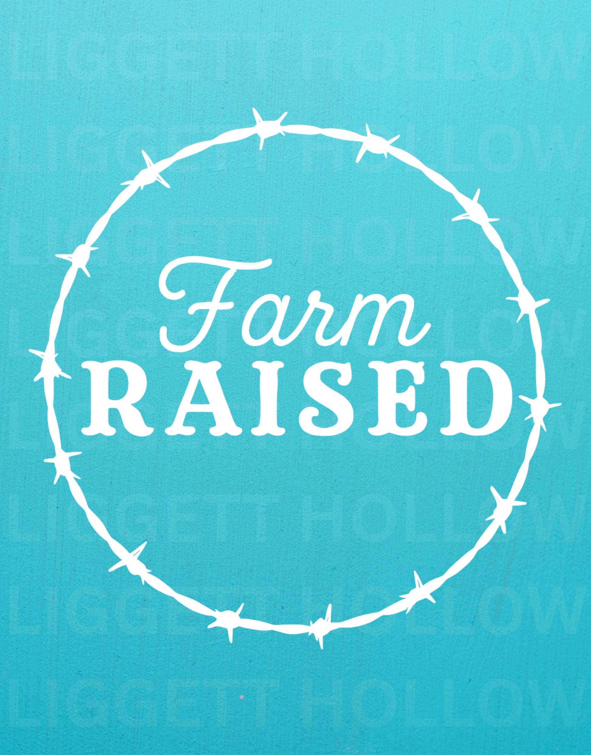 Show your country pride with this bold "Farm Raised" vinyl decal, featuring a rugged barbed wire circle design that gives off true Southern charm. Whether you're a farm kid at heart or living the rural life every day, this vinyl decal is the perfect way to represent your roots.Available in multiple colors and sizes, this decal is designed and crafted by me, Shelby, at Liggett Hollow Designs – where every piece is made with a little grit and a whole lot of heart.