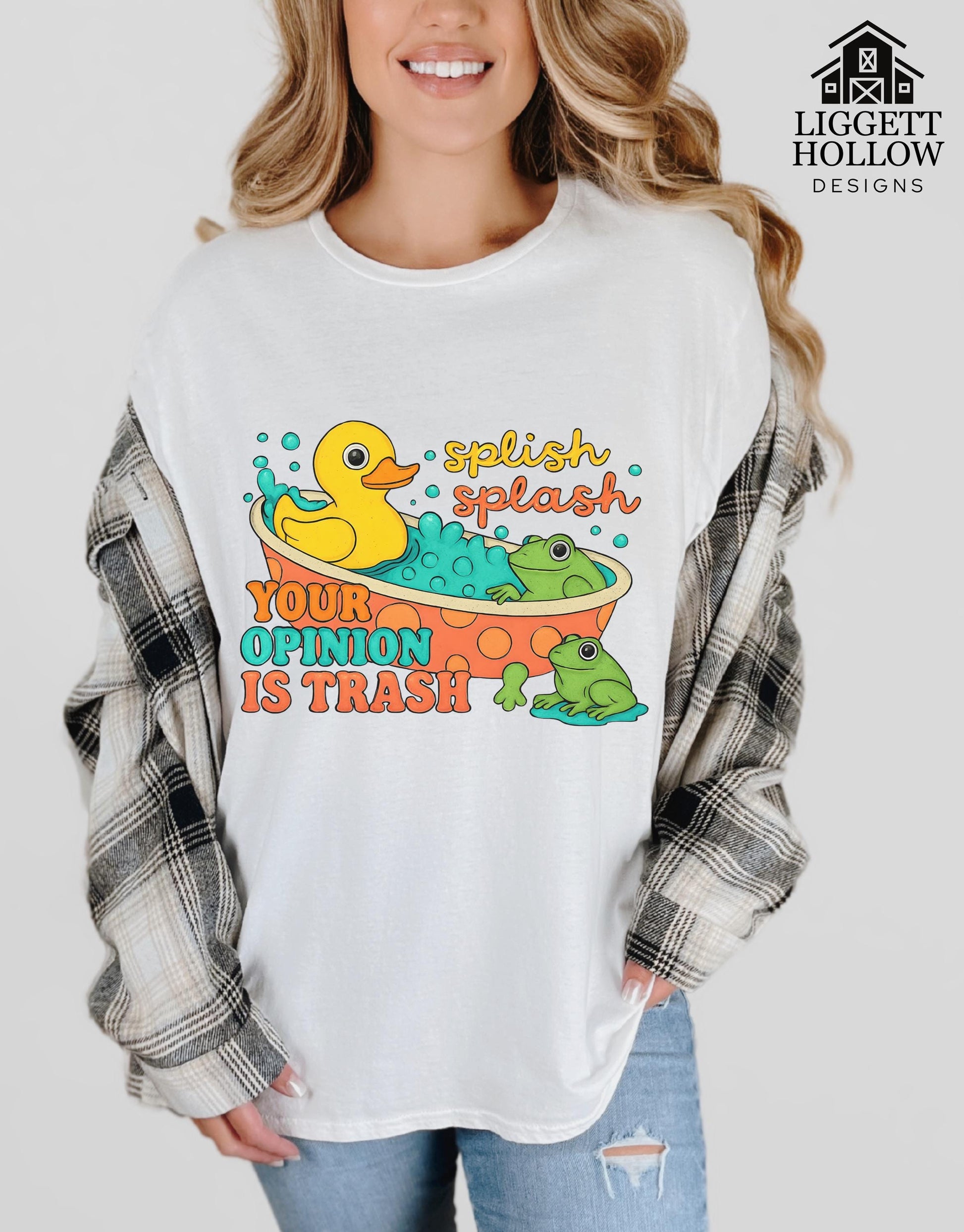 Bring some playful sass to your wardrobe with the Splish Splash Your Opinion Is Trash tee. Featuring a bright rubber duck, two unimpressed frogs, and a retro pop of color, this bold design is made for anyone who loves a little humor mixed with their style. The vibrant graphic feels both cheeky and fun, making it the perfect conversation starter for casual hangouts, coffee runs, or lazy days at home.