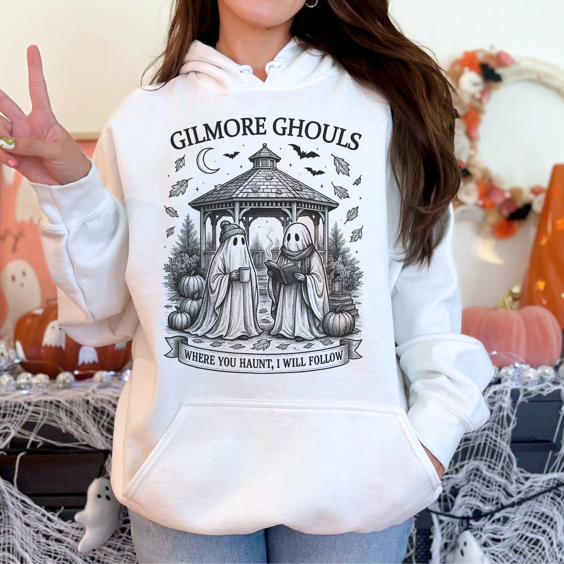 Step into spooky season with the Gilmore Ghouls Hoodie — a playful twist on your favorite small-town classic. Featuring two friendly ghosts in a whimsical gazebo scene, this design brings together cozy autumn vibes and a dash of Halloween humor.