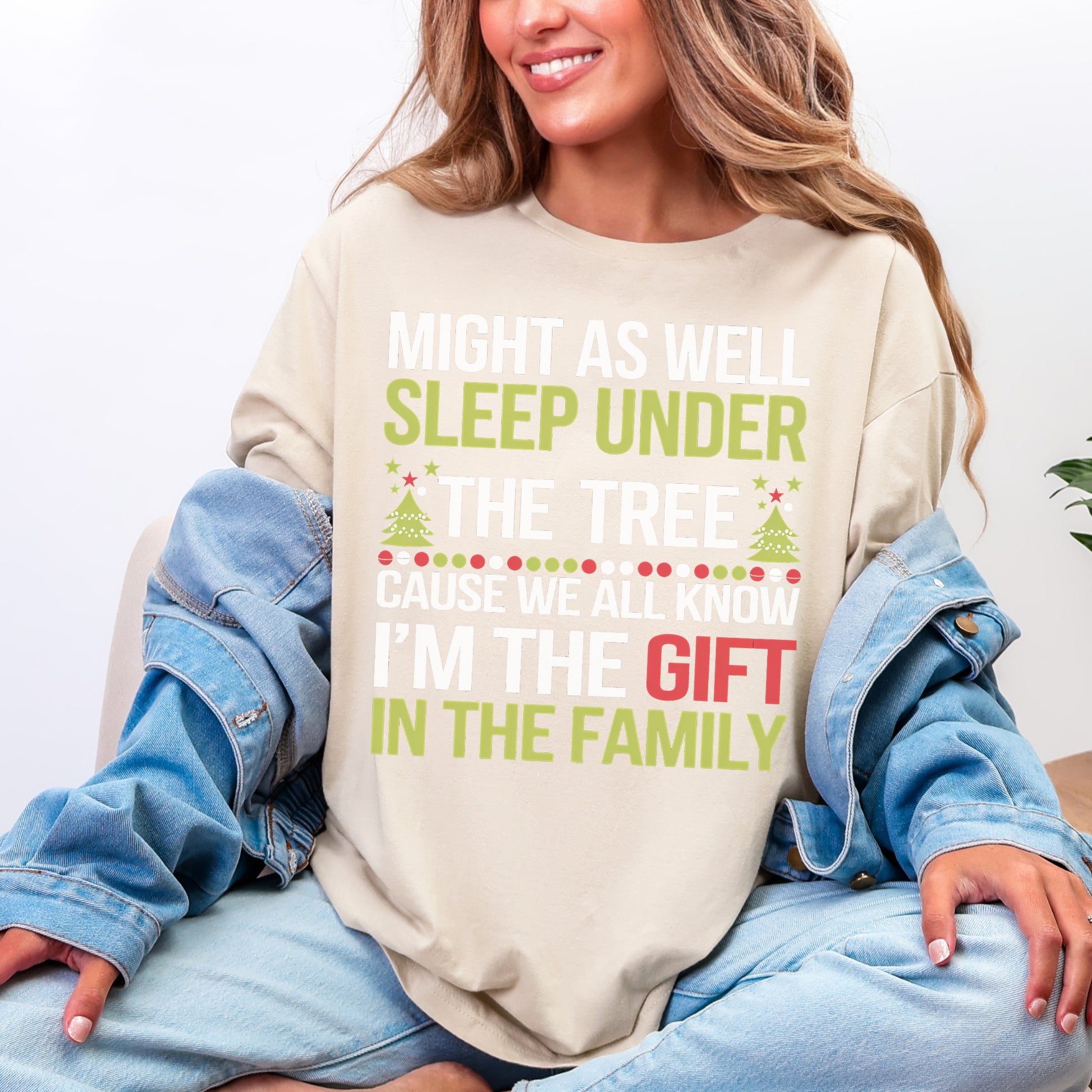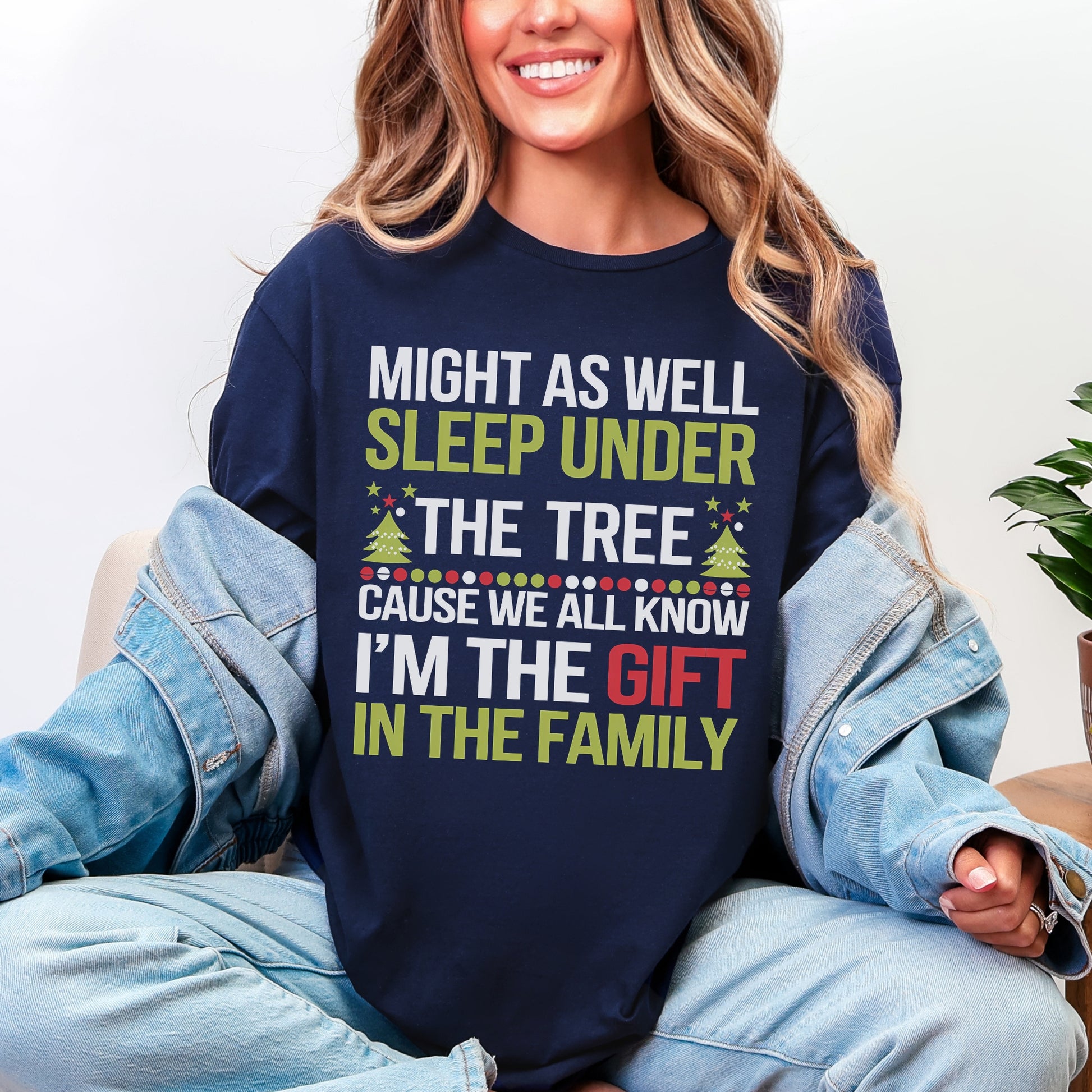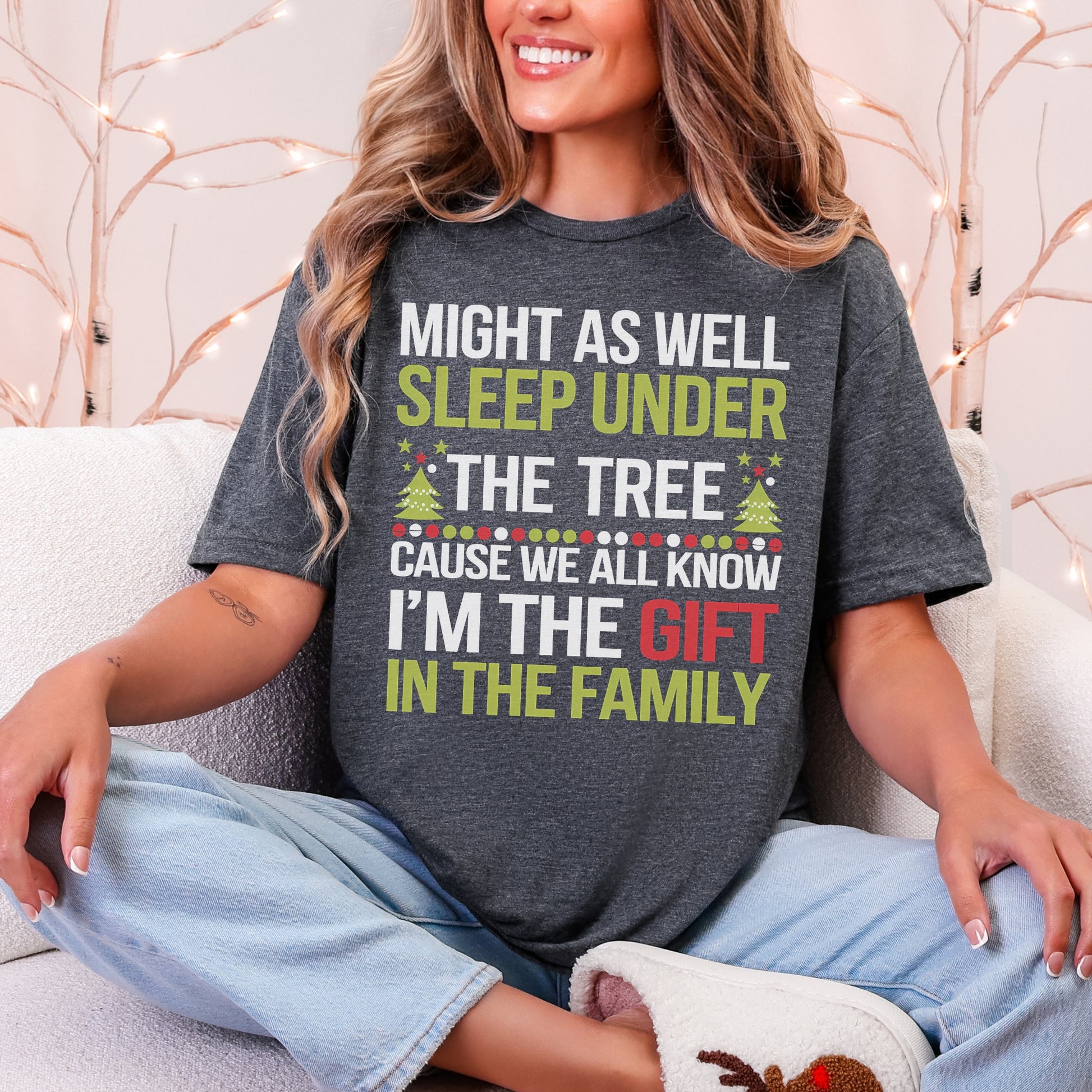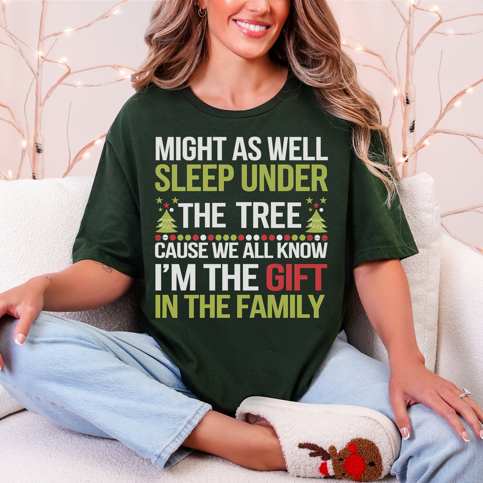 Let’s be honest—some of us are the gift, and this tee makes sure nobody forgets it. With bold holiday lettering and playful pops of red and green, the “Might As Well Sleep Under the Tree, ‘Cause We All Know I’m the Gift in the Family” shirt delivers the perfect mix of humor and holiday cheer.