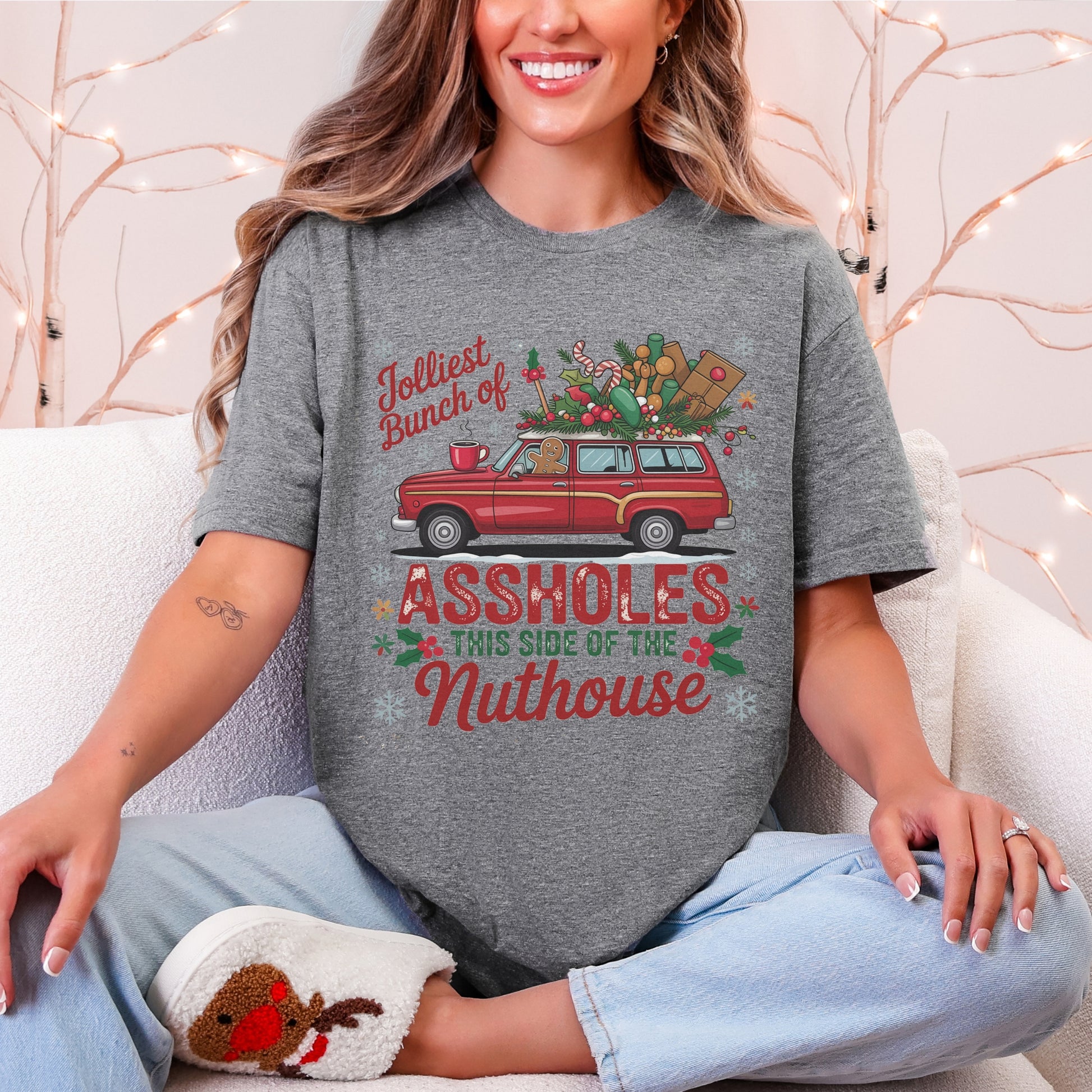 For the ones who bring the chaos and the cheer—this one’s for you. Inspired by one of the most iconic Christmas movie quotes of all time, our “Jolliest Bunch of A**holes This Side of the Nuthouse” tee captures that perfectly dysfunctional holiday energy we all know and love.