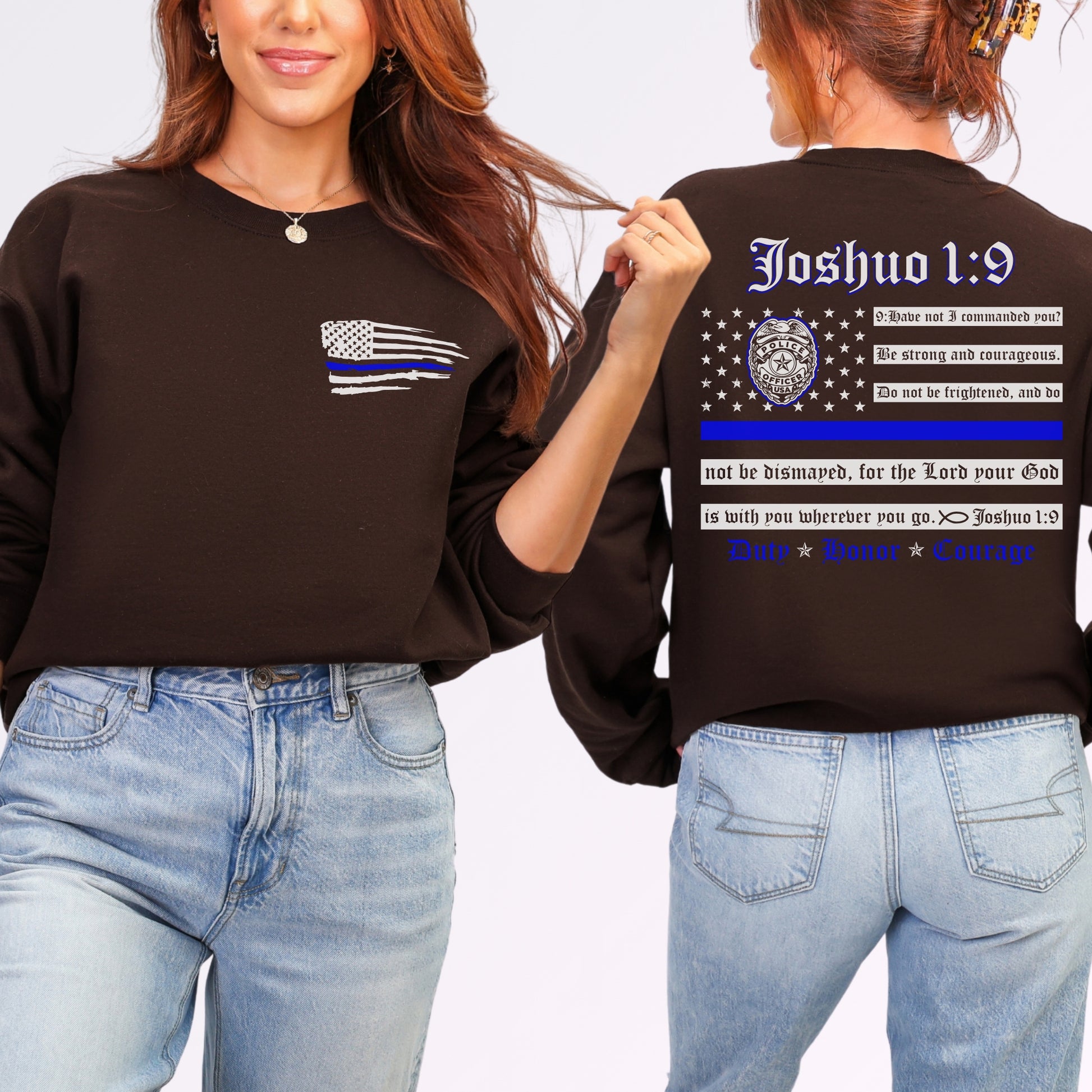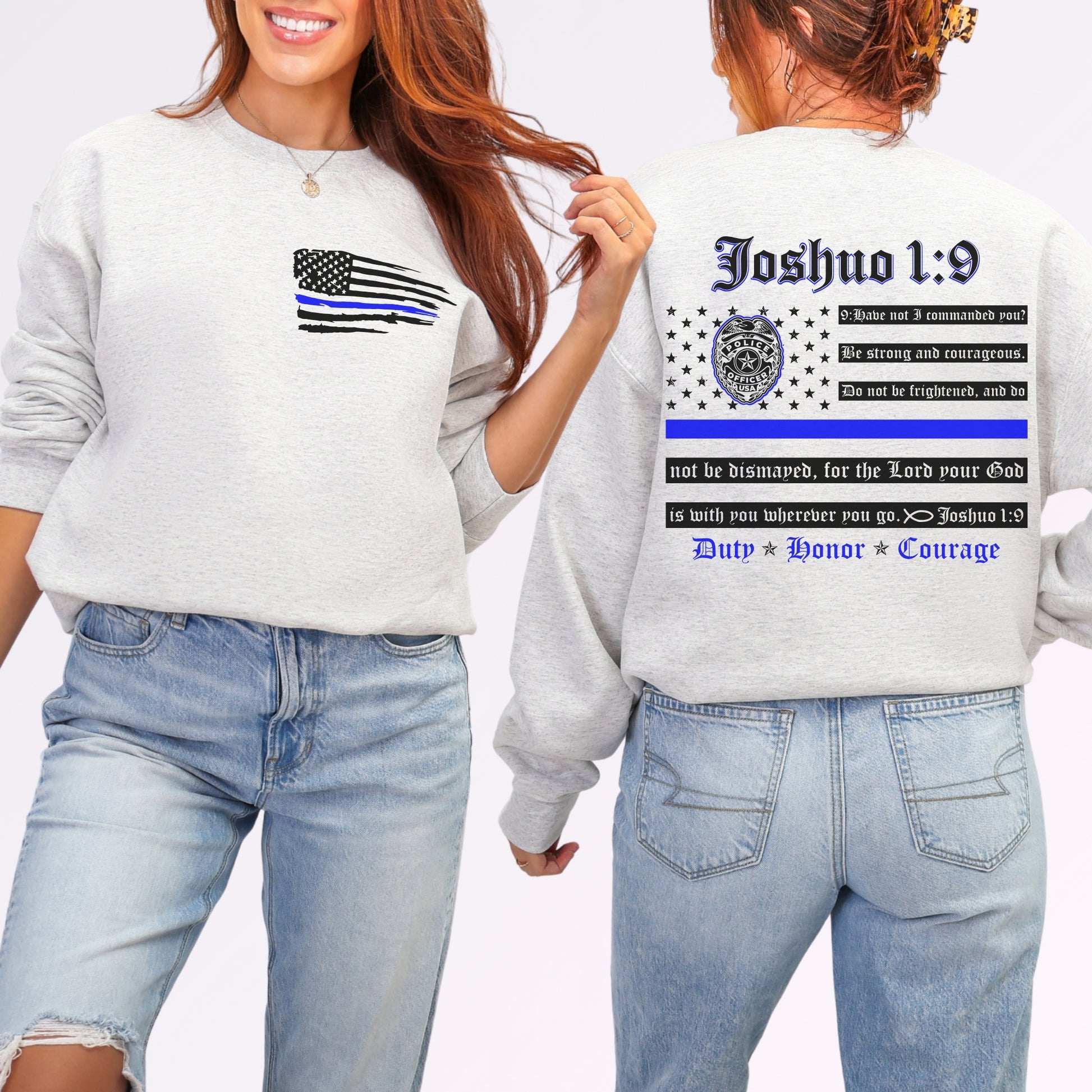 “Joshua 1:9 — Duty, Honor, Courage” Thin Blue Line Crewneck | Patriot Collection