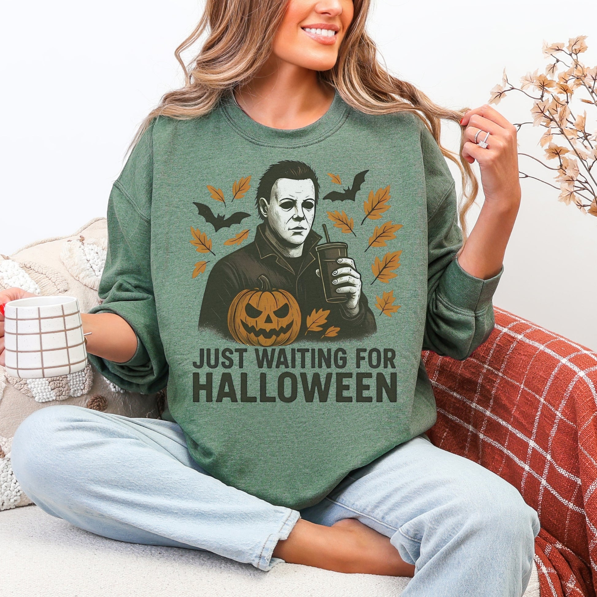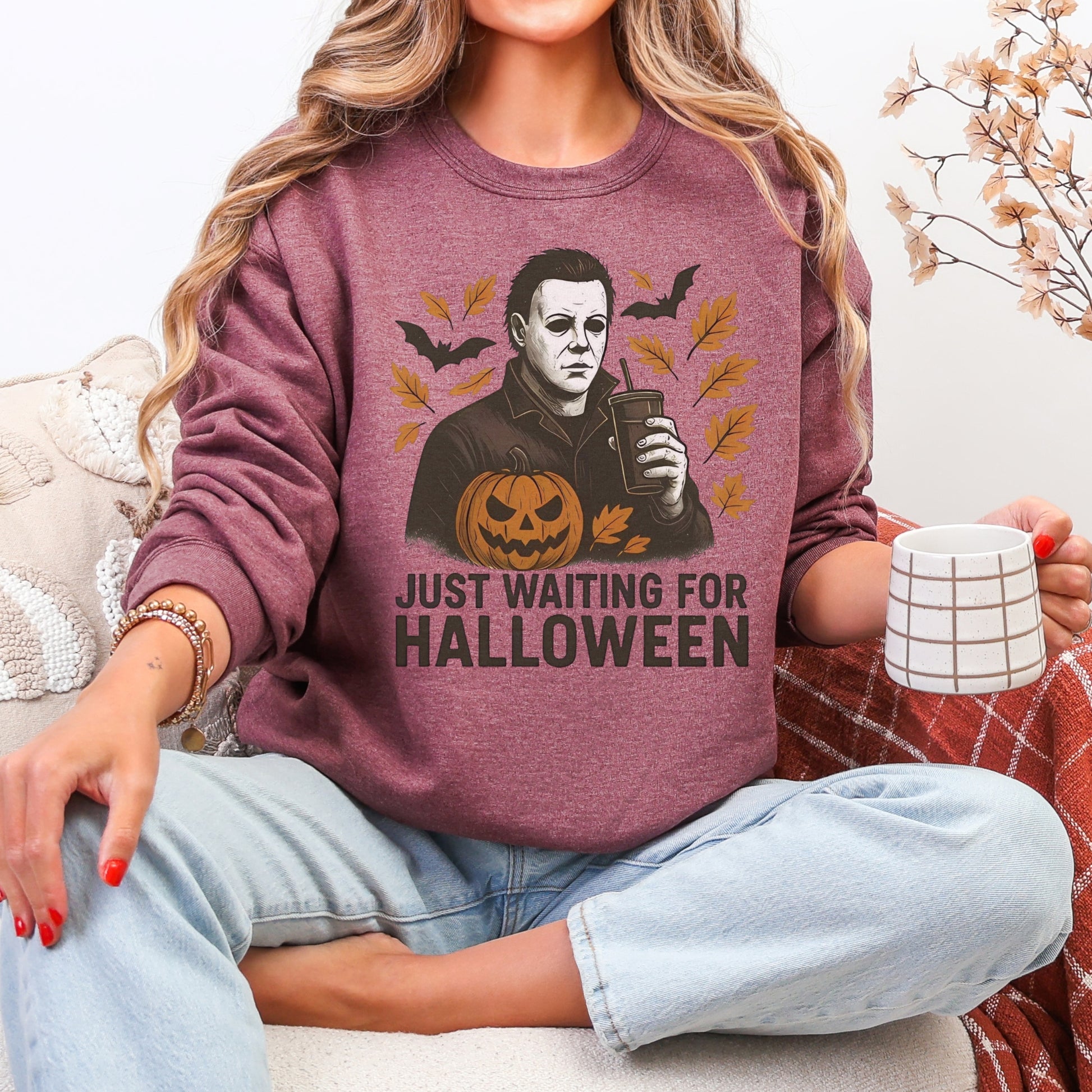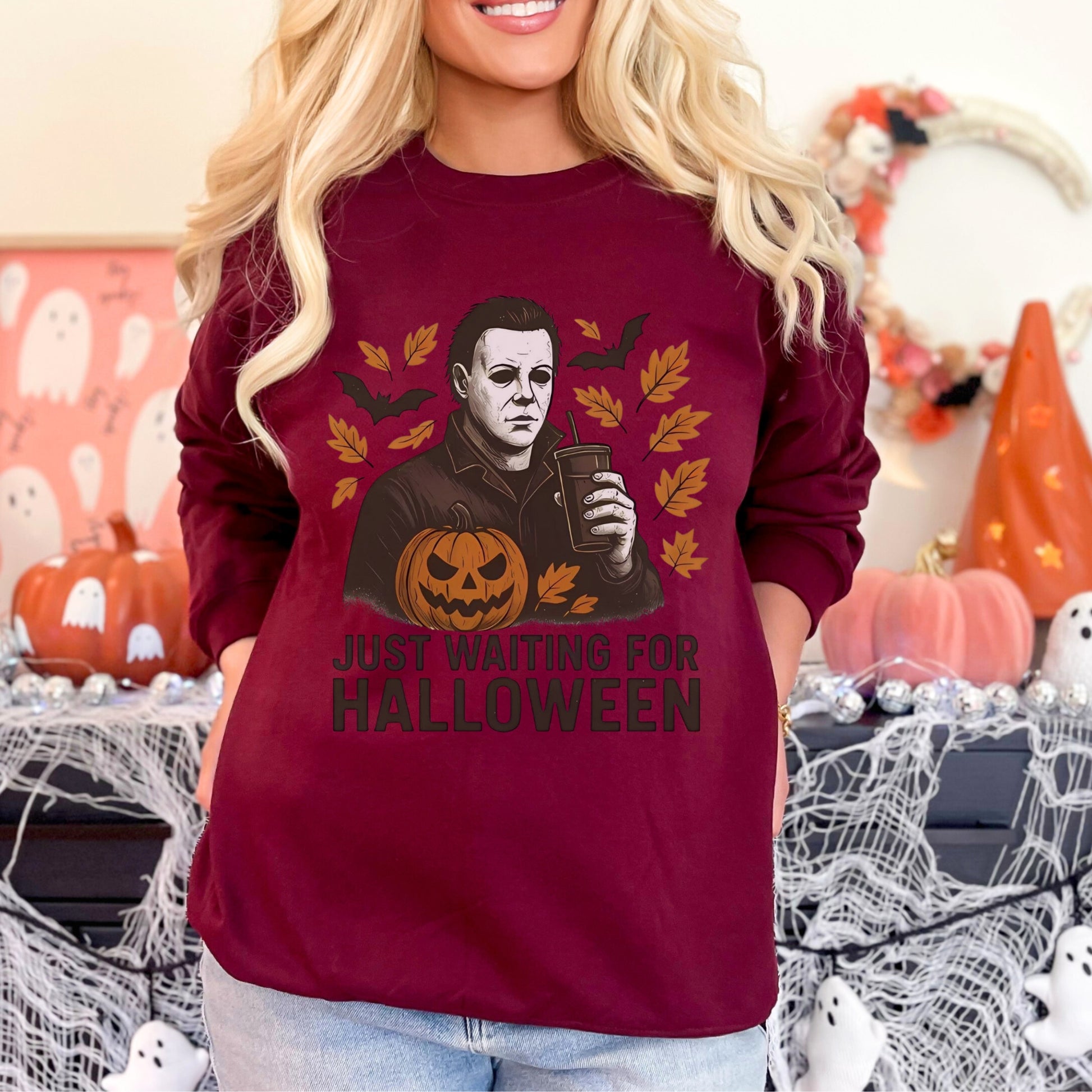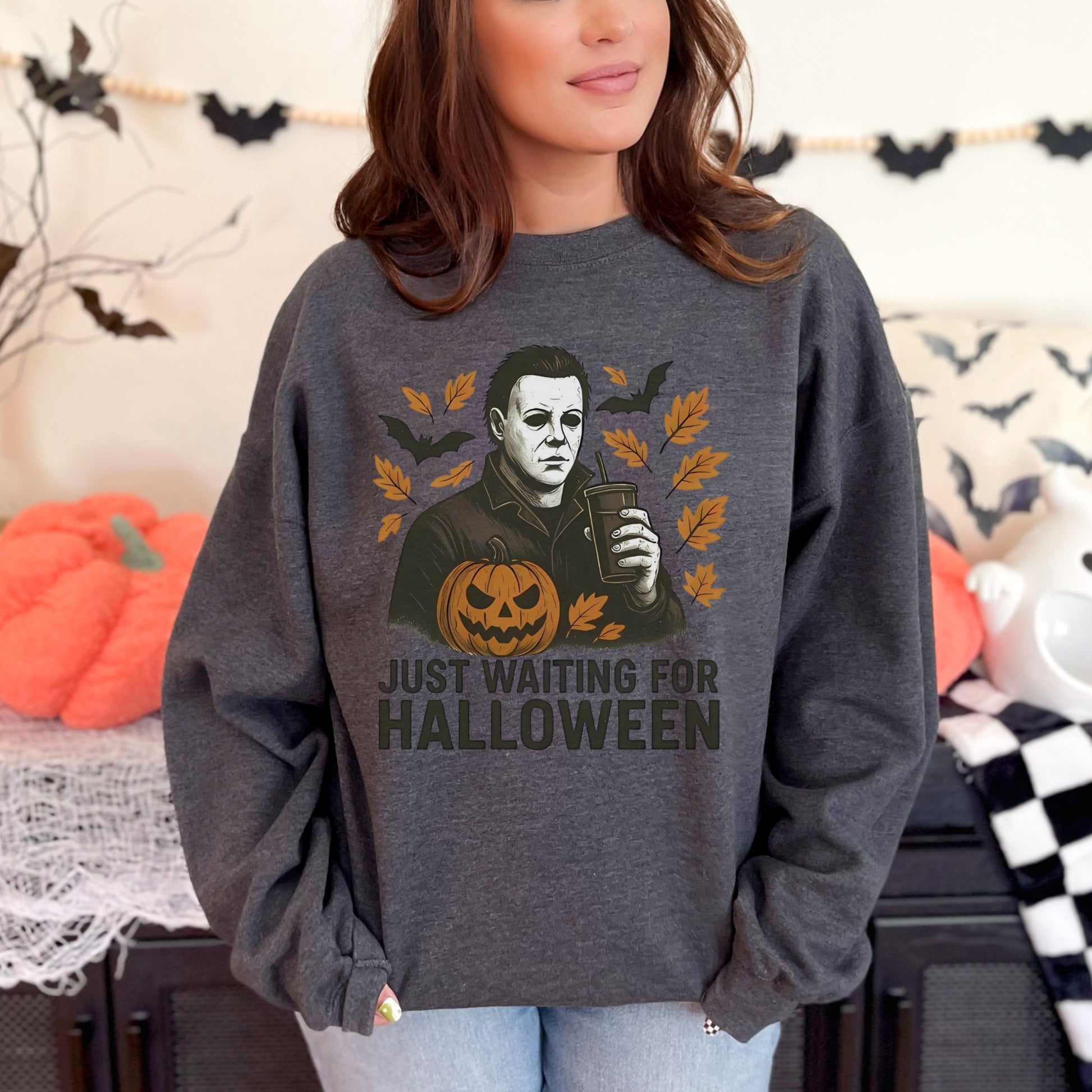 Channel spooky-season vibes with the Just Waiting for Halloween crewneck sweatshirt. Featuring a bold graphic of a stoic Halloween character holding a drink, surrounded by pumpkins, leaves, and bats, this sweatshirt is the perfect mix of eerie and everyday casual. It’s the ideal piece for horror fans who can’t wait for October 31st to arrive. Whether you’re binging scary movies, carving pumpkins, or strolling through a fall festival, this sweatshirt adds a playful edge to your autumn wardrobe.