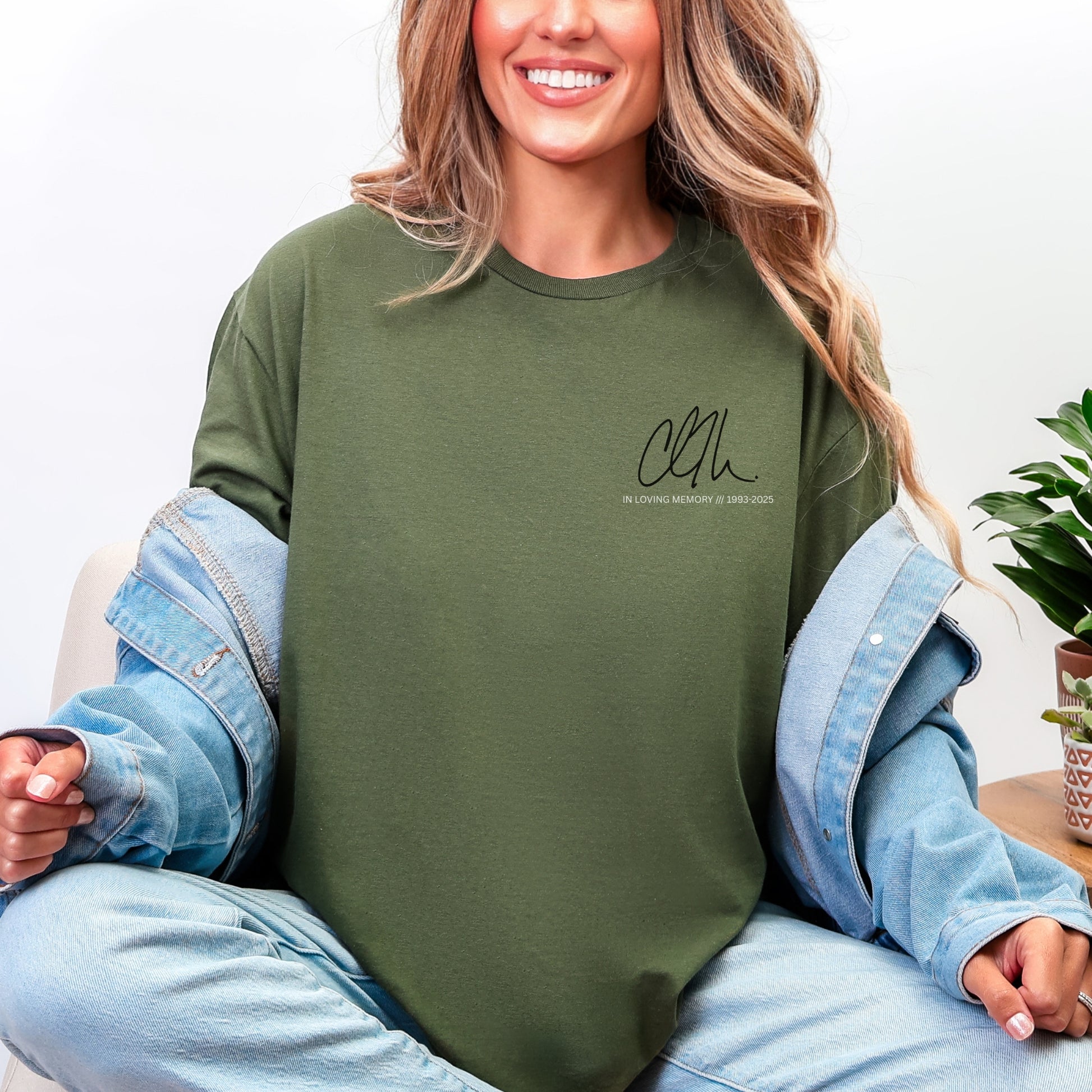 Across the back, bold lettering tells a story of identity, duty, and devotion — a reminder of what matters most when everything else fades. The front carries a minimalist memorial signature, understated but deeply personal, symbolizing the quiet strength of a man who stood for his beliefs without apology.