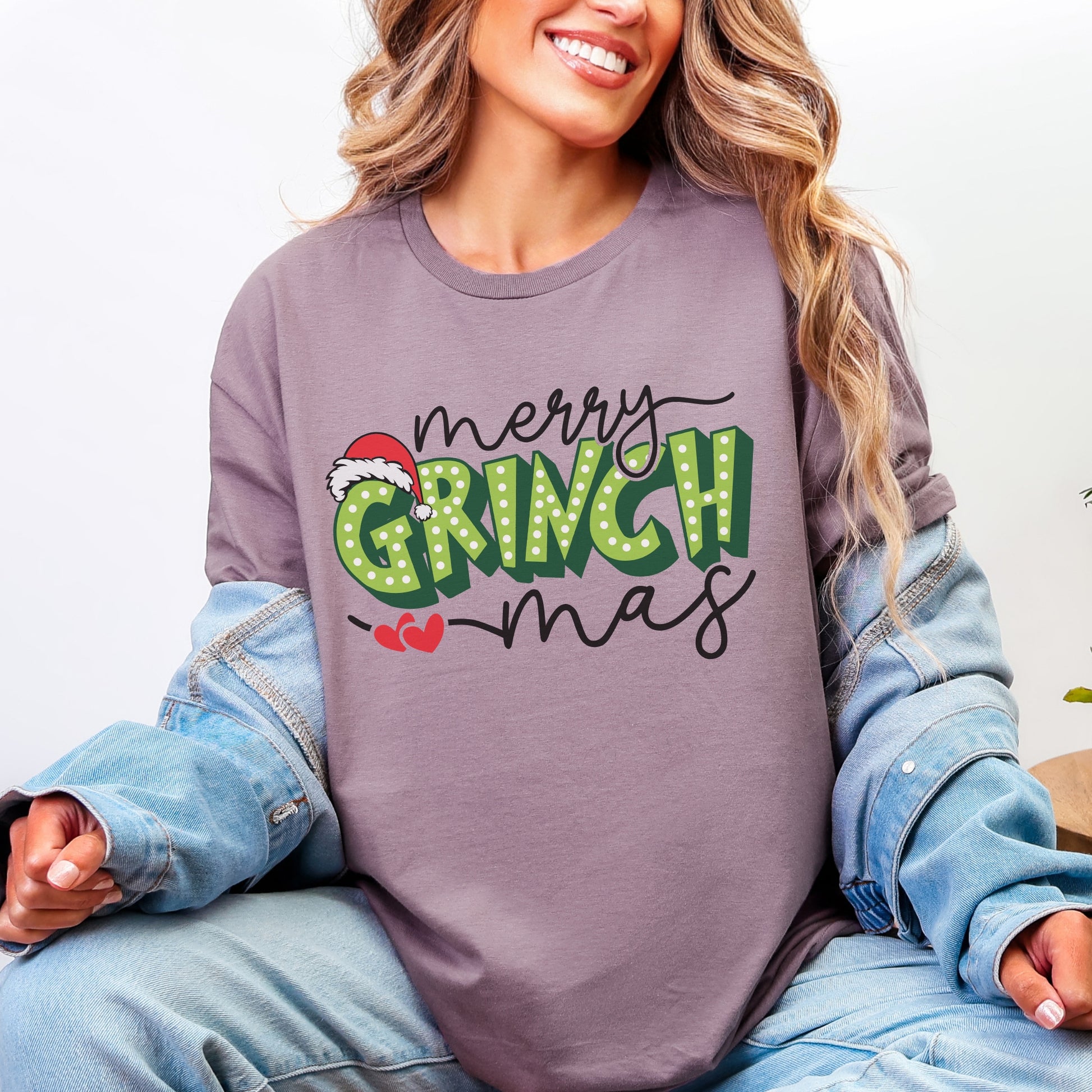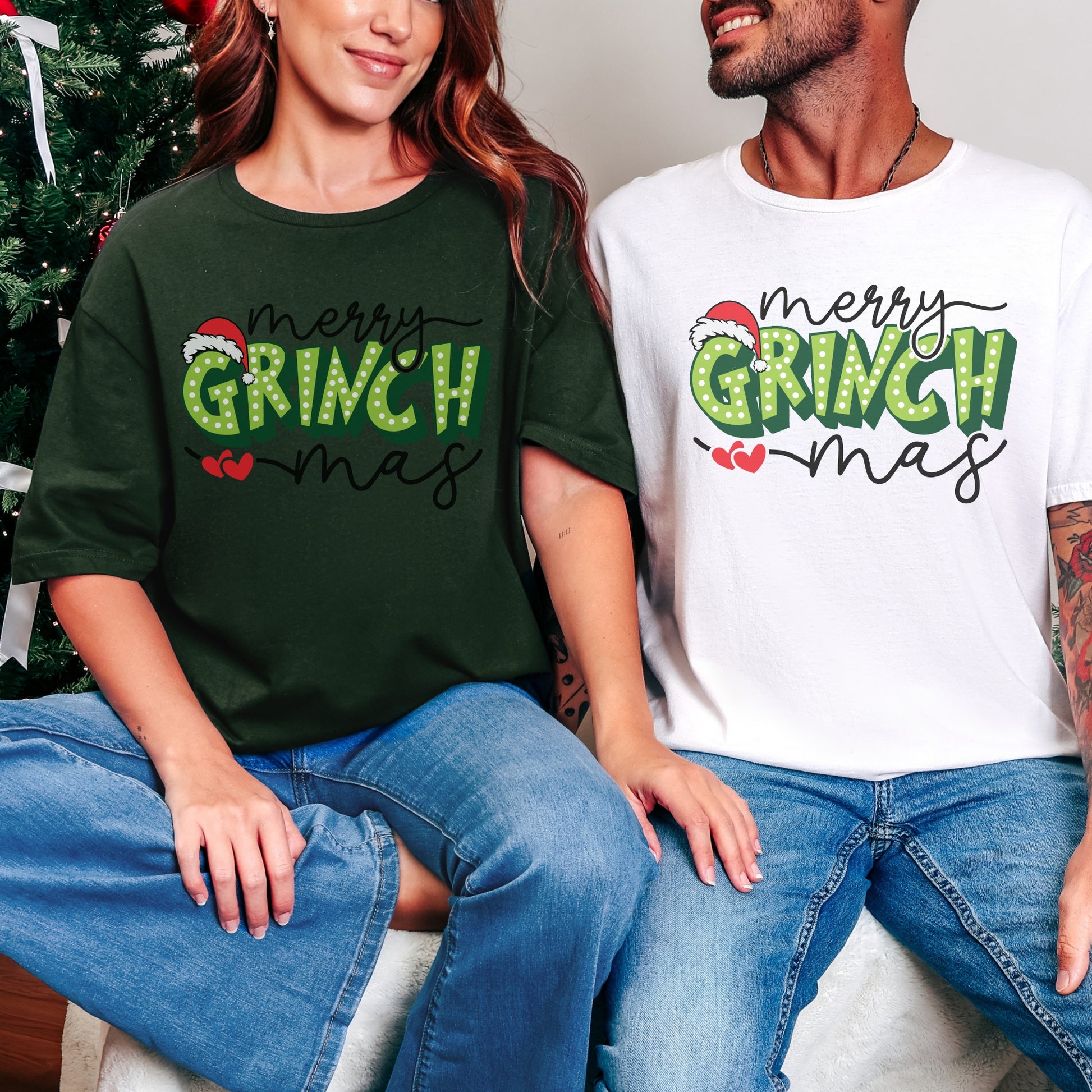Every family has one — the person who pretends to be a little “bah humbug” but secretly loves every bit of Christmas chaos. This Merry Grinchmas tee is made for them (or maybe… for you). Featuring bright green bubble letters trimmed with polka dots, a Santa hat, and a sweet little heart accent, this design is equal parts festive and funny.