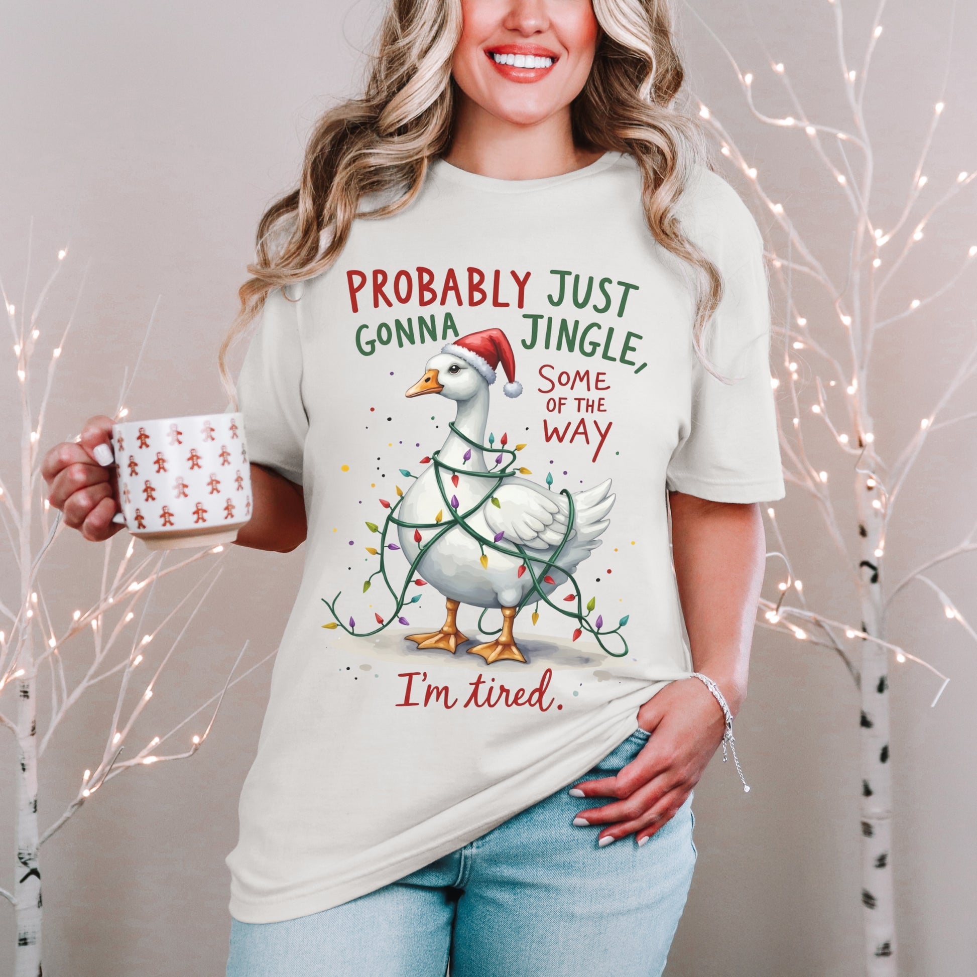 Because let’s be honest—some years we’re not jingling all the way… and that’s okay. This tee perfectly sums up the holiday hustle with a dose of humor and charm. Featuring a tired but determined goose tangled in Christmas lights and rocking a Santa hat, the design reads: “Probably just gonna jingle some of the way. I’m tired.”