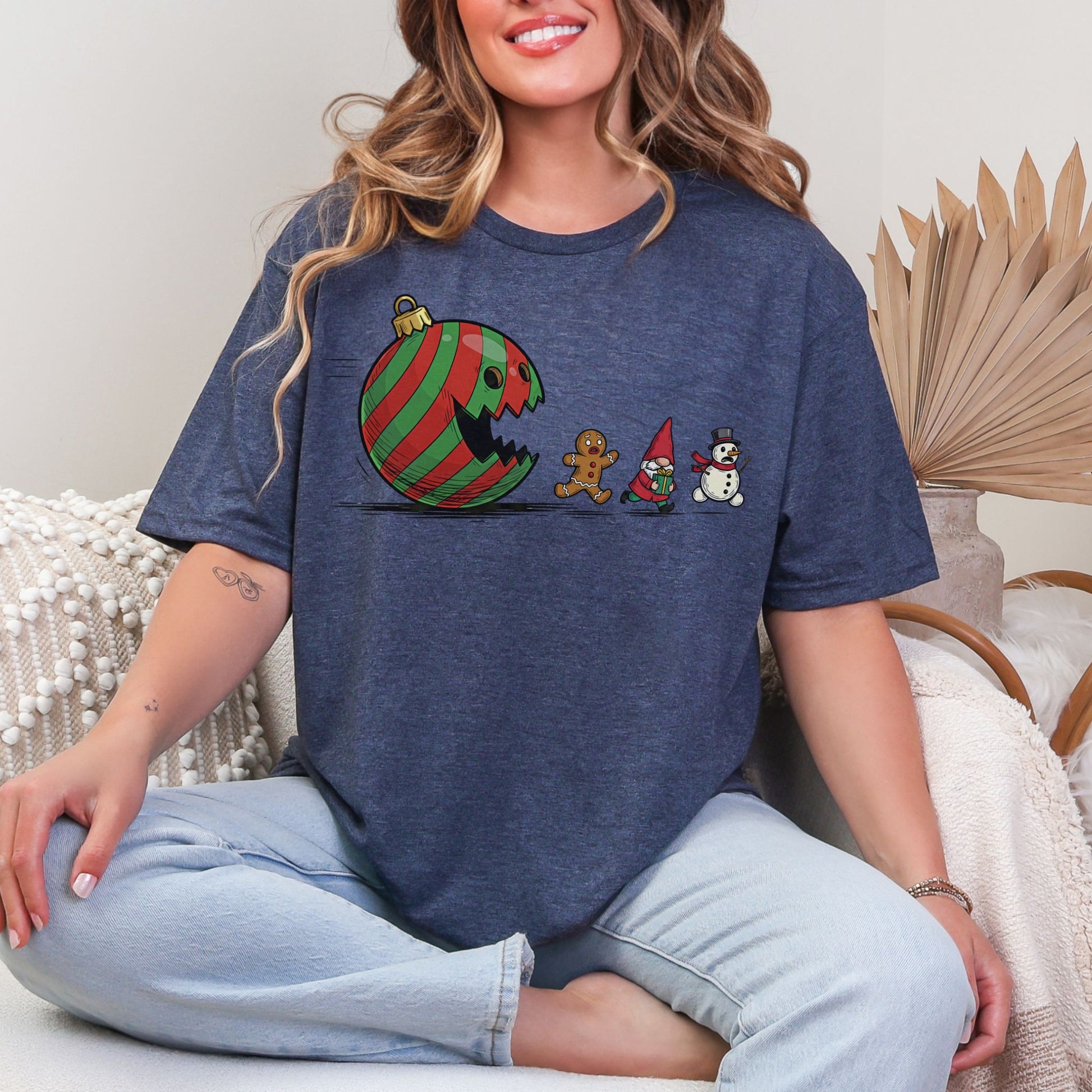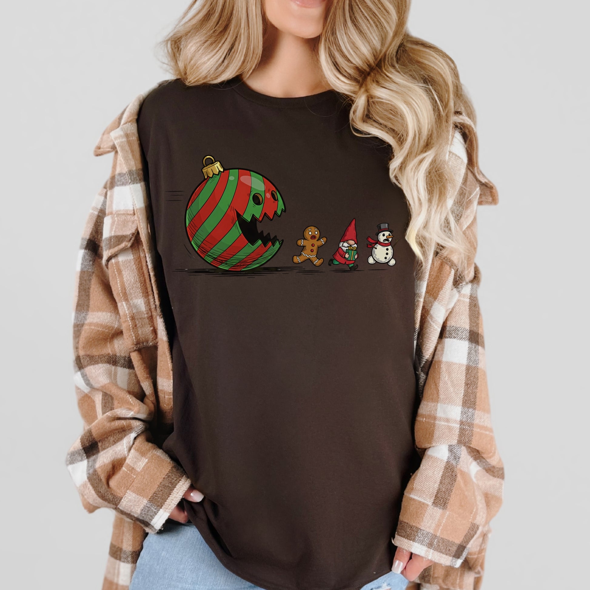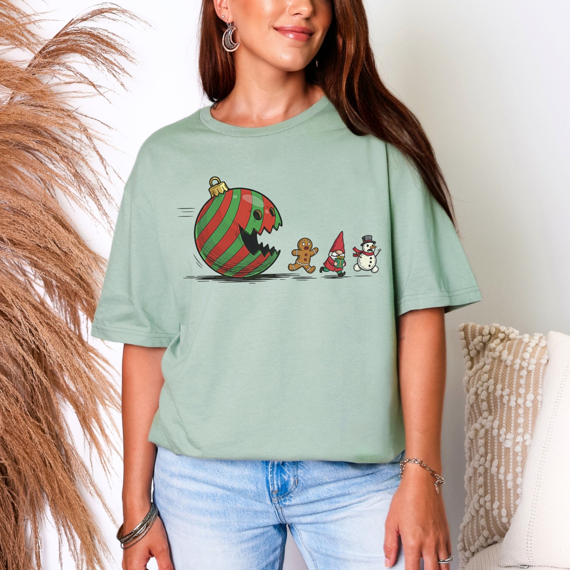 A Christmas twist on a classic chase! This hilarious tee features a bold red-and-green ornament gone rogue, chasing a gingerbread man, a festive gnome, and a snowman who clearly didn’t sign up for this. It’s lighthearted, fun, and made for anyone who loves a little humor mixed in with their holiday spirit.