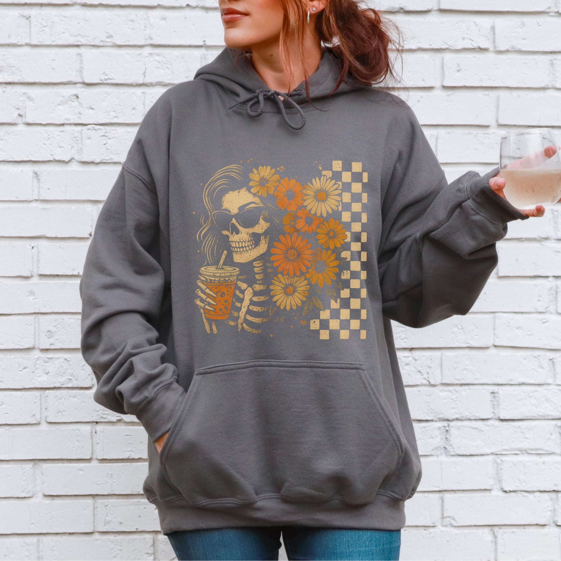 Bring a little edge to your autumn wardrobe with the Floral Skeleton Hoodie. This bold graphic blends spooky season charm with retro flower power, creating the perfect statement piece for cozy fall days. With its skeleton sipping iced coffee and surrounded by golden blooms, it’s a playful nod to everything we love about cool weather and casual style.