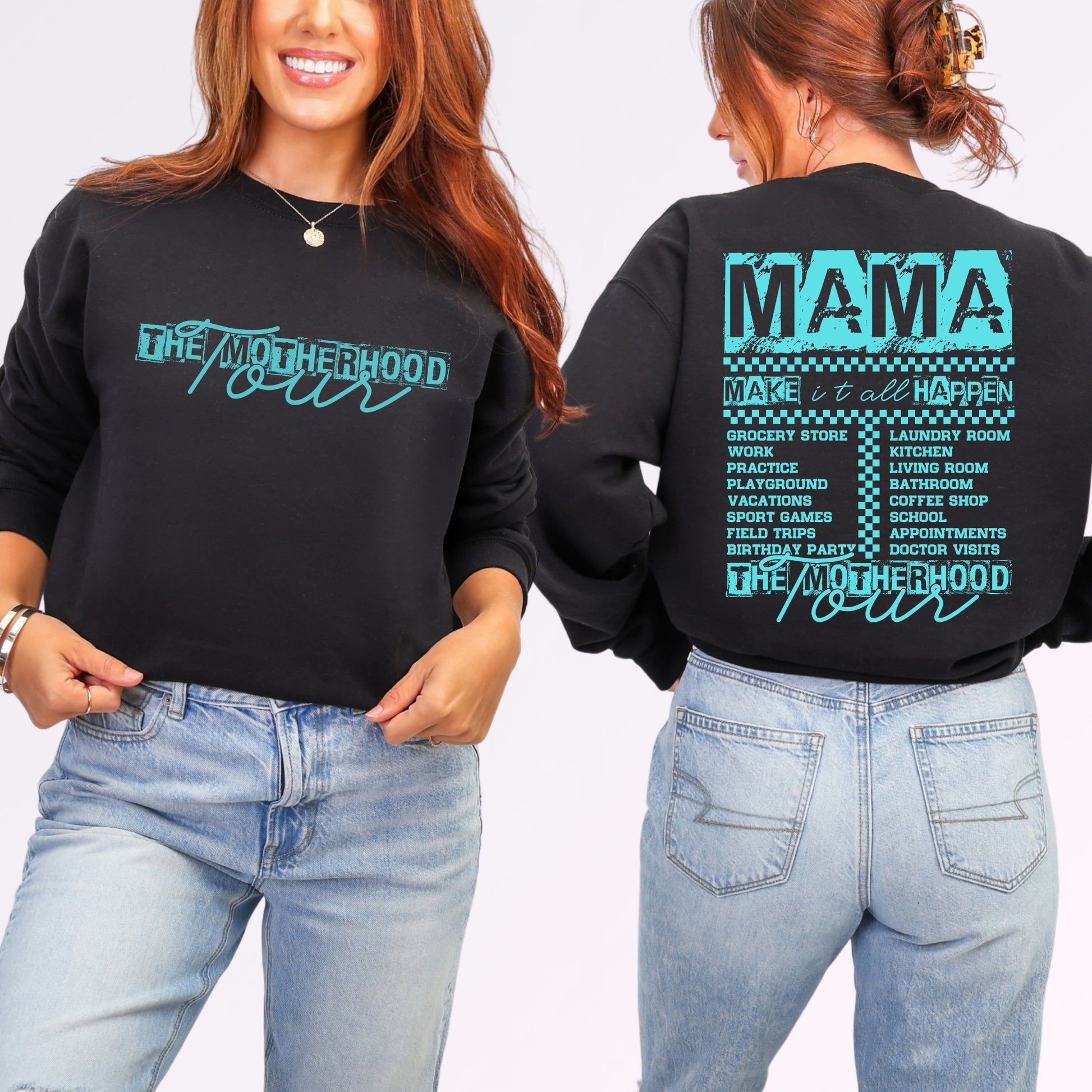 Motherhood really is the ultimate tour — and this sweatshirt captures it perfectly. Our “The Motherhood Tour” sweatshirt features a bold graphic on the front and a concert-style tour list on the back, highlighting all the places moms make it happen: from grocery store runs and school drop-offs to coffee shops, practice fields, and beyond.