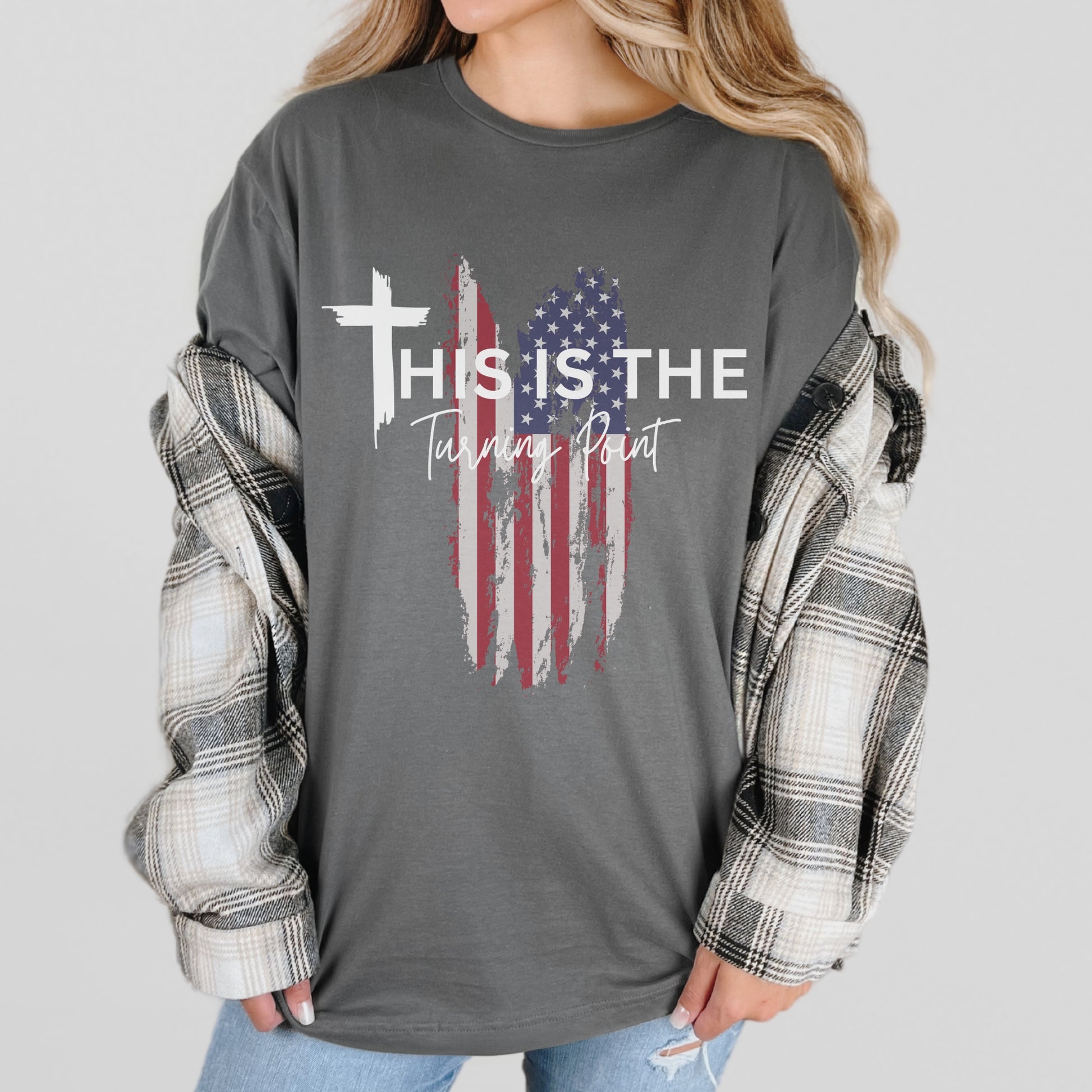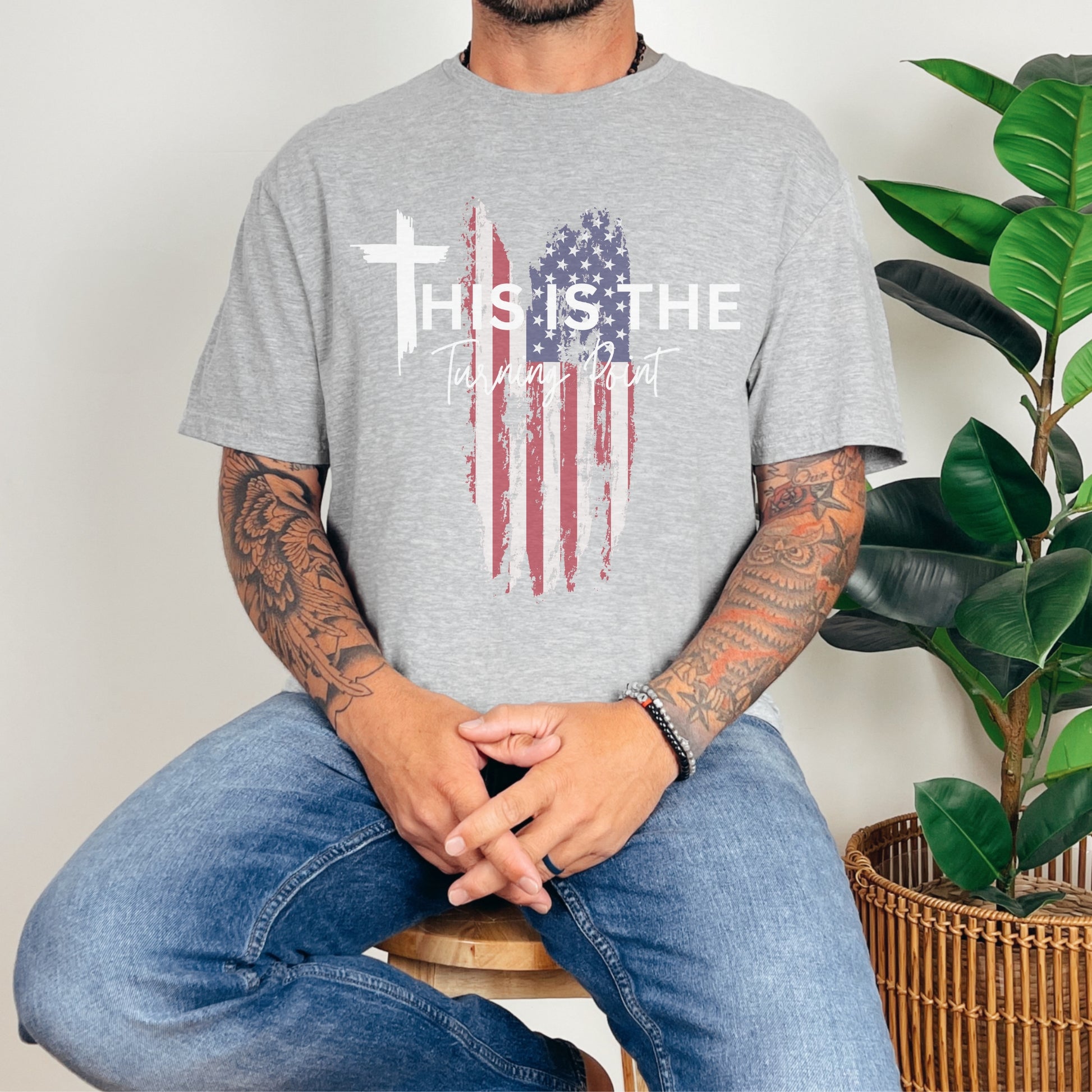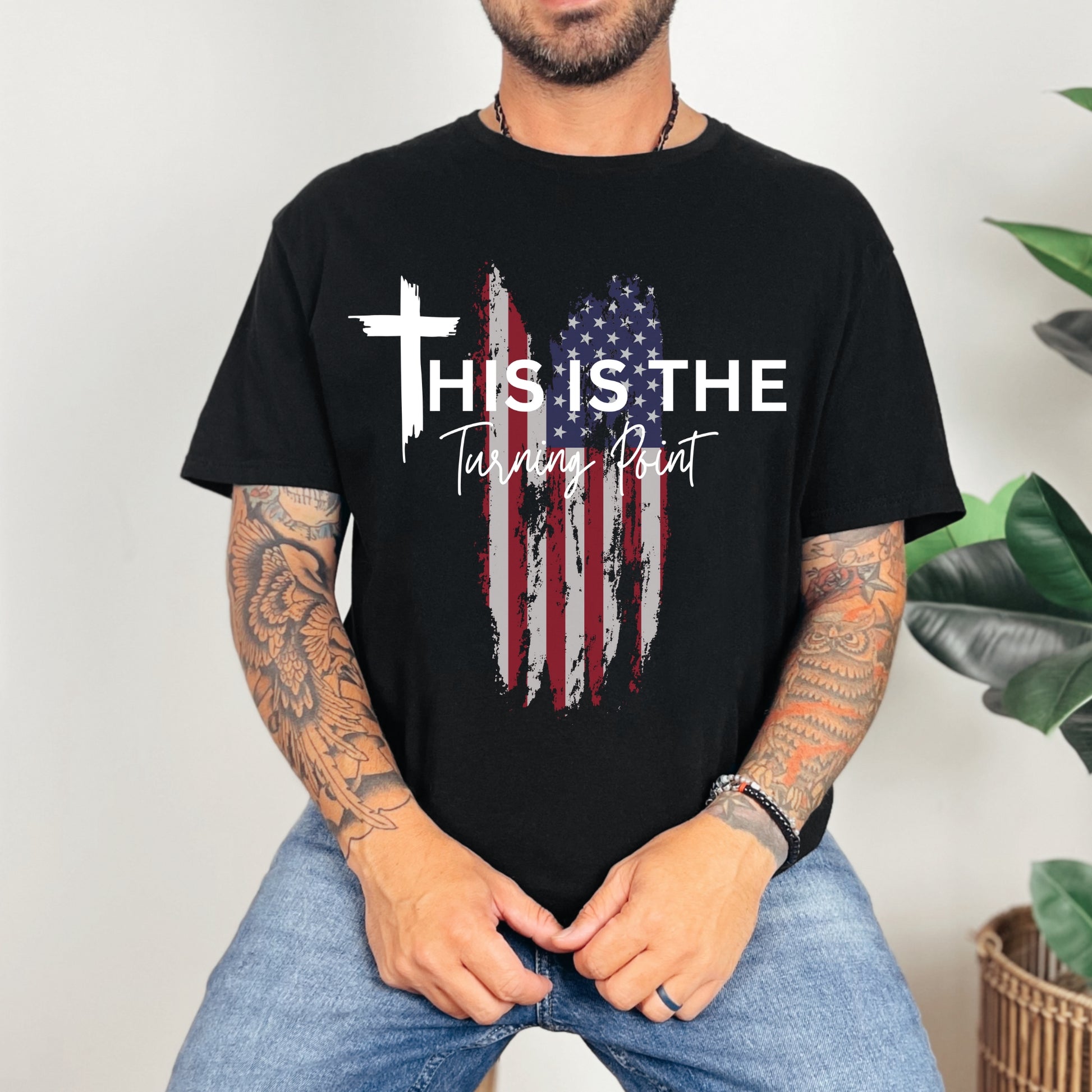 The cross and the flag, side by side. This design reminds us that faith and freedom are inseparable — and that every generation must decide when to take its stand. With the words This is the Turning Point stretched across a distressed American flag, this shirt makes a clear declaration: the moment is now.