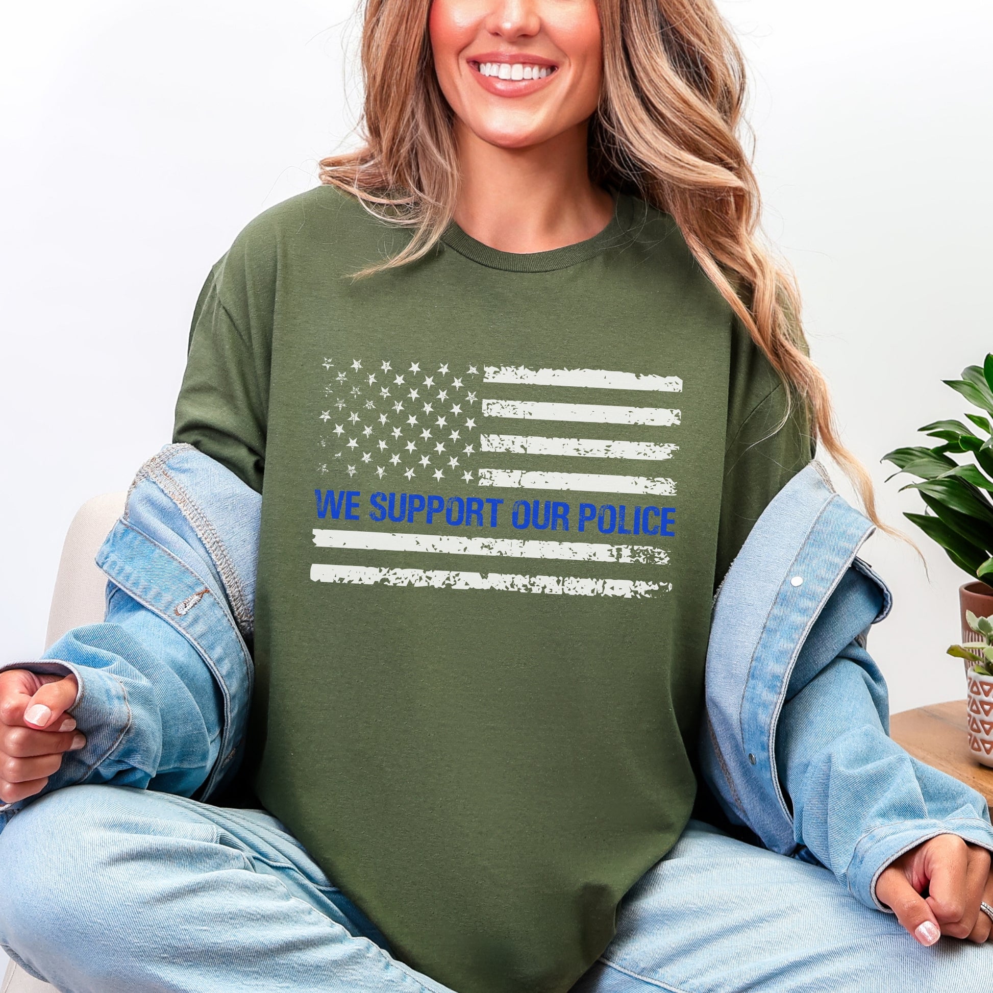 The “We Support Our Police” T-shirt is a clean, classic design created to honor the men and women who serve and protect our communities. The distressed American flag and Thin Blue Line detail represent strength, sacrifice, and unity, while the bold message across the center says what so many of us believe — we stand with our police.