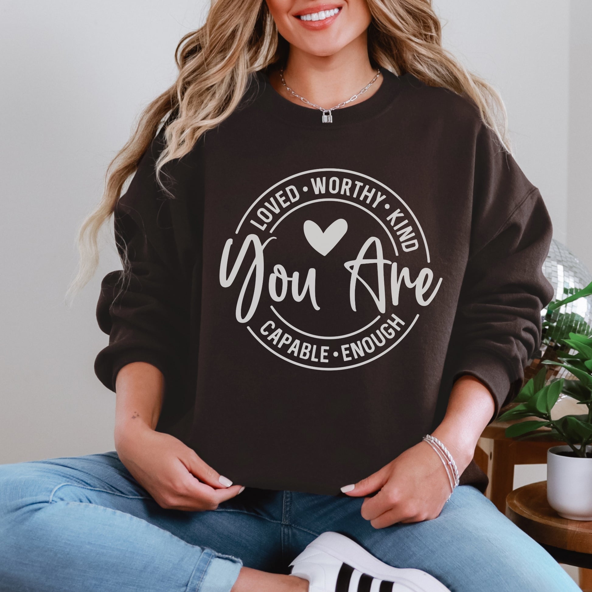 A little reminder goes a long way — and this sweatshirt delivers it beautifully. Our “You Are” sweatshirt features an uplifting affirmation circle that highlights what we all need to hear more often: You are loved. You are worthy. You are kind. You are capable. You are enough.